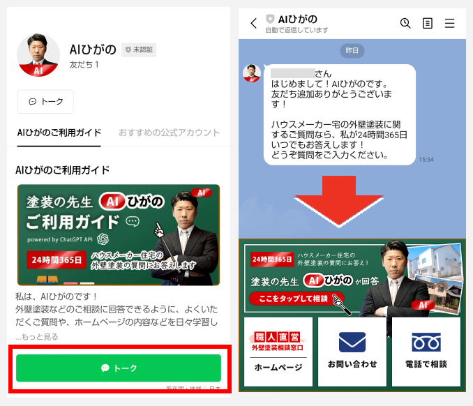 - 2. トークを起動。「AIひがのが回答」ボタンをタップ!