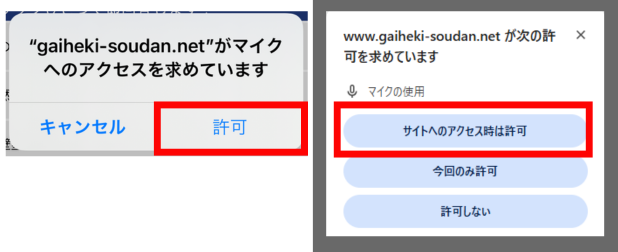 ご利用になるには、必ず「マイク入力を許可」してください。もし、許可しないを選択してしまった場合は、ページをリロードして再度お試しください。