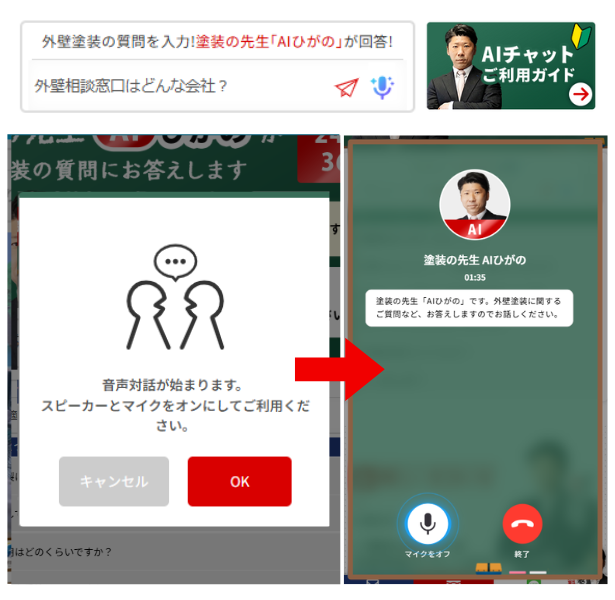 AIとの音声対話でも、外壁塗装・屋根塗装などの質問や相談ができます! AIひがのと、気軽に電話のような感覚で対話をしてお悩み解決ができます。