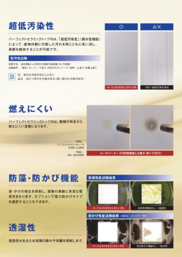 塗膜は親水性機能によって、建物外観に付着した汚れを洗い流し、美観を維持することが可能です。 - 難燃性
