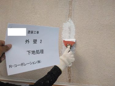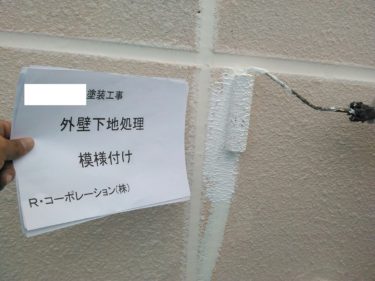 外壁 下塗りの様子です。汚れた部分を目立たなくしていきます。
