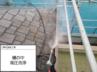 高圧洗浄で汚れを落としてから塗装工事を行っていきます。