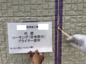 外壁目地部分の目地部分のプライマー塗布作業です。