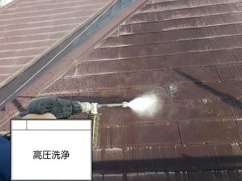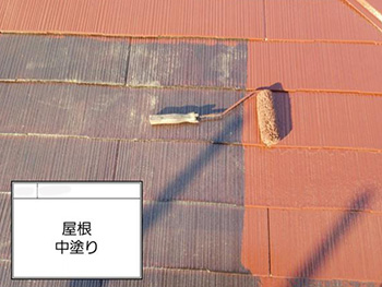 屋根中塗りの様子です。塗料を全体的に塗ります。