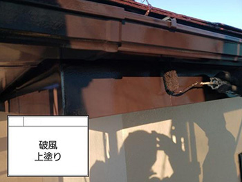 破風上塗りの様子です。茶色の塗料でしっかり塗りこみます。