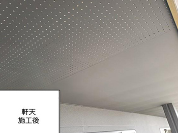 施工前の軒天です。雨風は当たりませんが、湿気により変色している箇所が見られます。