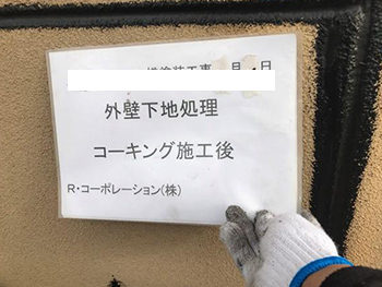 施工中の外壁です。プライマーを塗布した後、目地部分をコーキング剤で埋めます。