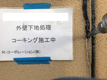下地処理中の外壁です。目地以外のヒビもコーキングしていきます。